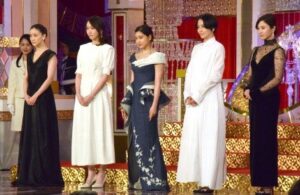 真ん中の土屋太鳳さんの向かって左が新垣結衣さん。右が長澤まさみさんです。おふたりとも同じくらいヒールの高いくつをはいているようです。